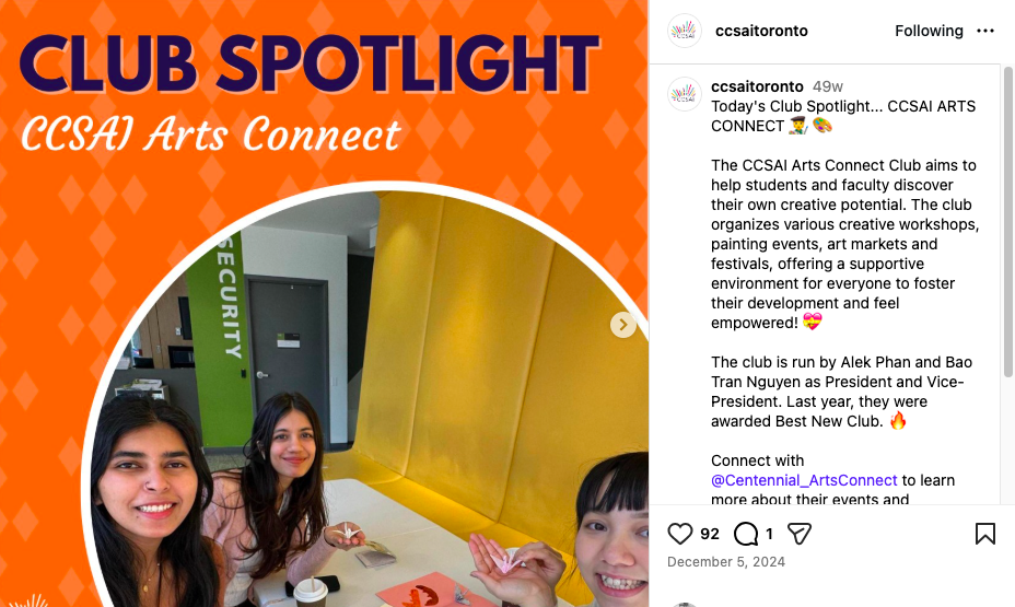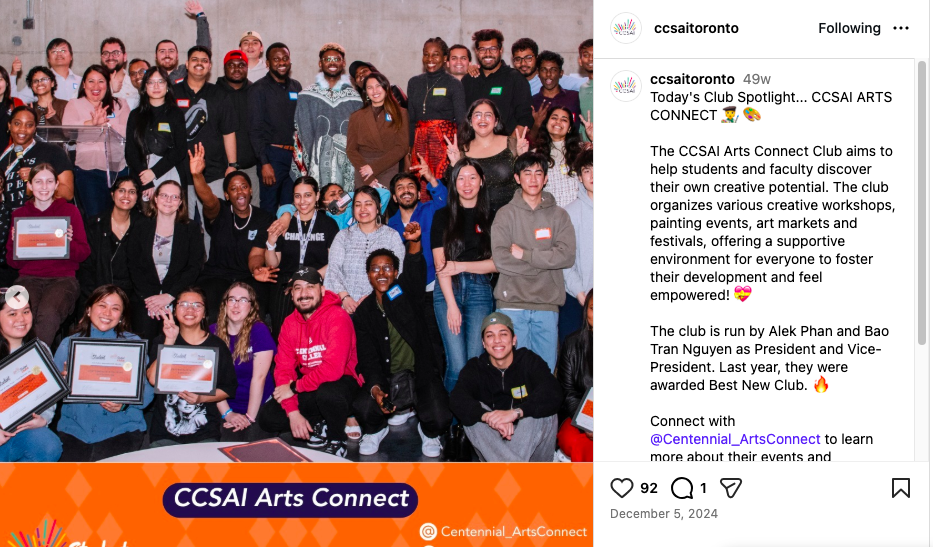 Recognizing this gap, Alek reached out to classmates and initiated the formation of Arts Connect. Bringing together 11 students from diverse backgrounds, including domestic students in Canada, and others from Turkey, Vietnam, the Philippines, Hong Kong, China, Colombia, and Nigeria, they successfully registered Arts Connect through CCSAI. What began as a student initiative has since grown into a community where creative practice is rooted in belonging and mutual support.